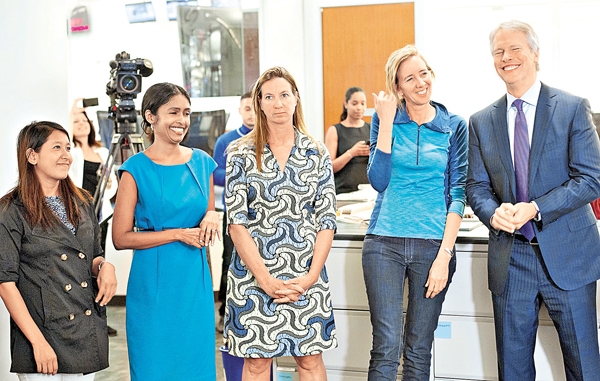 ■美聯社記者圖辛(左1)、門多薩(中)和麥克道爾(右2)接受CEO祝賀。 美聯社