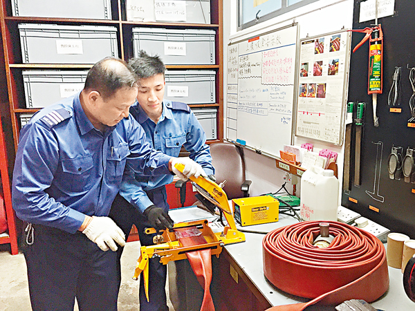 ■消防員示範如何為針孔式穿洞的消防喉進行修補。 楊佩韻 攝