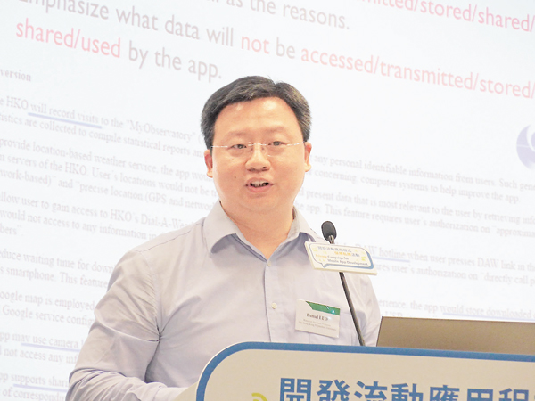 個人資料私隱專員公署昨日舉辦研發流動應用程式論壇,向業界推廣網絡保安,以及如何保障和尊重個人資料。理工大學電子計算學系研究助理教授羅夏樸(圓圖,岑志剛 攝)表示,理大研究團隊用一年半時間,分析1,197個Google Play商店上的應用程式,發現當中的282個私隱政策聲明出現問題,其中約180個程式的私隱聲明有遺漏;約40個程式的私隱聲明與使用的第三方函式庫(Library)不一致;三四個程式表明不會收集某類資料,但實際上卻有收集。詳細報告計劃在今年6月發佈。