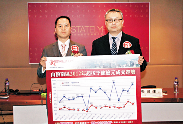 中原地產指出,首季山頂南區的23宗成交中,二手佔16宗。在該16宗二手成交中,成交宗數較上季升77.8%,當中分層單位佔12宗,洋房佔2宗,屋地佔2宗;涉資約32.98億元,增幅284.8%。期內二手成交金額大增,主因錄得多宗洋房創新高成交,包括山頂Mount Nicholson 6號屋以8.3億元成交,赫蘭道2號亦以13億元易手。