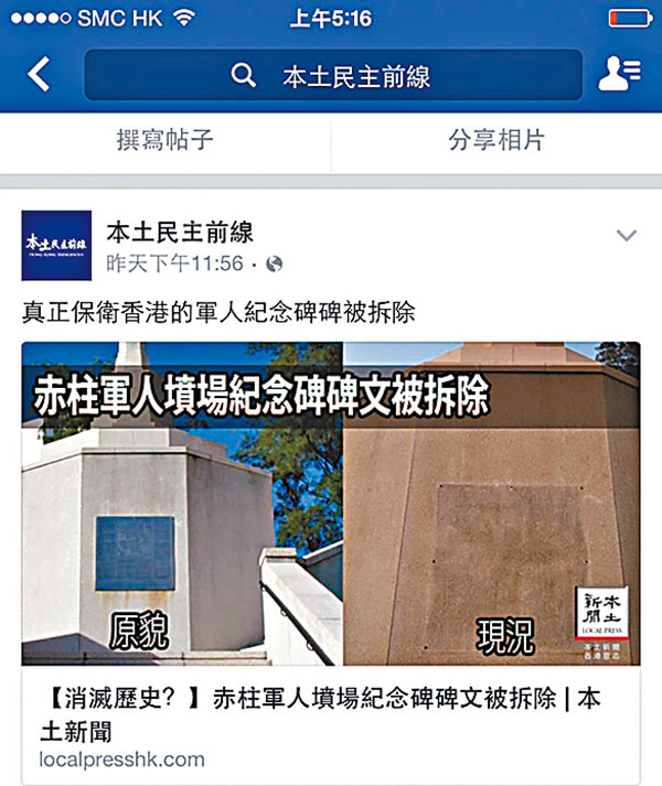 不過,原來這些激進「本土派」都跟車太貼。管理赤柱軍人墳場的「英聯邦戰爭公墓委員會」,其職員吳先生向「本土新聞」表示,碑文只是暫時拆下翻新,預料翻新期約一個月。各激進「本土派」拒不認錯,當然不會刪帖,但還是以「更新」的方式轉發了該段澄清,陳雲則僅在其轉貼帖子中刪去了「要抗議」三個字,臉皮厚,當冇事發生過。 ■記者 鄭治祖