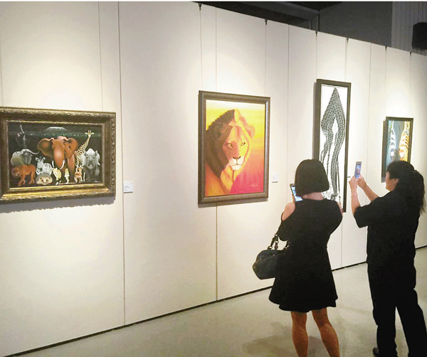 ■觀眾在觀賞《非洲印象》展的畫作。記者葛沖 攝