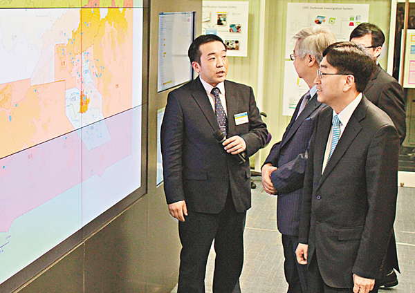 ■衛生防護中心人員向食物及衛生局局長高永文介紹「傳染病資訊系統」。莊禮傑 攝