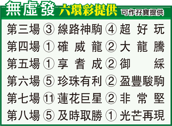 第六場「珍珠有利」雖然曾四捷千二米,但踏入六歲開始轉型,上仗在谷草一哩一放到底,而且彈甩對手輕勝兩馬位,今仗續跑此程,有力乘勝追擊。「盈豐駿駒」今季在三班起步亦曾三度上名,今仗重返四班強項出王牌上陣,料不會無的放矢,半冷選擇。