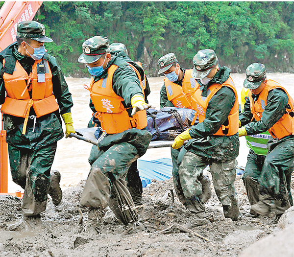 ■部隊官兵轉移遇難者遺體。 新華社