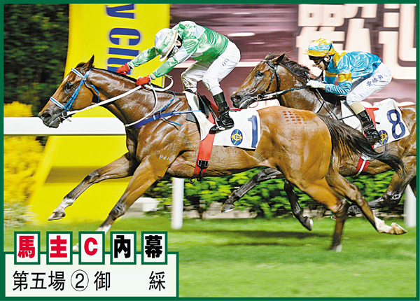 第五場、第三班、一二○○米。「御綵」(圖1號)前仗跑同程敗在超級馬「活力小駒」蹄下獲亞,該役排大外檔,結果放棄頭段來跑仍後追上名;上次排七檔對牠必有幫助,起步後跟守馬群中間位置,不過入彎時兜出外疊打衝鋒蝕位太多,最後只追回一席第三。今次練者再報谷草千二誓師,環看對手並不太強,再配合方廄季尾攻勢,當有優先捧場之道。
