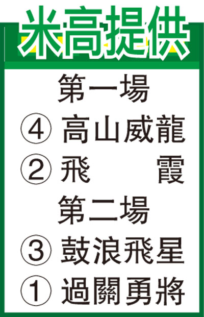 第一場、第五班、一○○○米。「高山威龍」剛於同程敗給「飛霞」,但以本身演出穩定,今仗續跑此程兩駒再遇,絕對有條件反先。「飛霞」剛於同程打開勝門,輕勝個半馬位,反映在五班的確佔上風,開竅後出王牌續跑此程,雖排外檔形勢稍差,惟質新馬持續進步,且看能否克服難度。