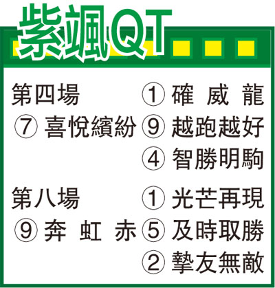 第四場、第四班、一二○○米。蔡約翰馬房之「喜悅繽紛」,澳洲三歲棗色自購新馬。其父Starcraft,屬二千年栗色新西蘭馬,源自美國馬Soviet Star一族,贏過十一場,路程由千四至二千四百米,當中包括一級賽,在港同父馬有「活力寶」、「有得威」及「皇者拍檔」等。其母Freestyle,屬○二年棗色澳洲馬,源自澳洲馬Snippets一族,贏過四場,當中包括二級賽。「喜悅繽紛」在上年九月份開操,至今試閘共七次,其中試過兩次谷閘,獲得一冠一亞。此駒試準而臨,已有一出即勝本錢。
