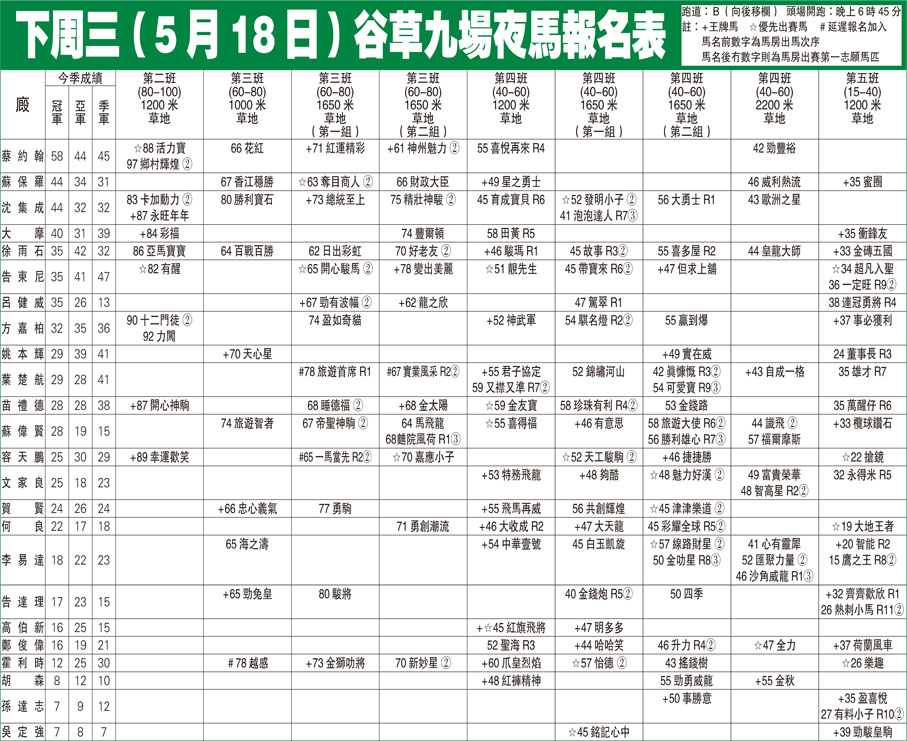下周三(5月18日)谷草九場夜馬報名表 (2016-05-13) (圖)