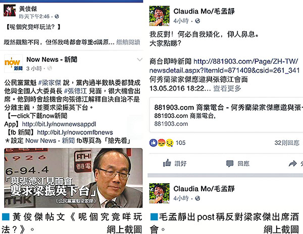 「青政」向公民黨開火,身為該黨議員的毛孟靜,首先做的是與黨友劃清界線。她在其fb中留言稱:「我反對(梁家傑出席會面)!何必自我矮化,仰人鼻息。」有其支持者留言大讚她「敢言」,網民「Philip Chan」更稱,「(公民黨)咁醜陋,毛姨姨會唔會考慮退黨?」想當年,曾為公民黨「開國功臣」之一的湯家驊因多次與「黨領導」意見不同而被迫退黨,但所謂「雙重標準是常識吧」,相信毛姨姨為選票「出賣自己人」,未必會有咩後果。 ■記者 鄭治祖