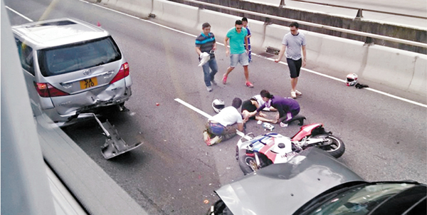 昨日下午2時許,一名姓余(21歲)青年駕電單車沿長沙灣呈祥道中線西行,當至明愛醫院對開一「快相」位時,突失控撞向前方一輛七人車,電單車繼而向後反彈,撞及尾隨的寶馬房車,釀成3車「串燒」,男鐵騎應聲倒地受傷。一名香港航空空姐與另一名據報是聖約翰救傷隊休班隊員的男子,上前為傷者檢查傷勢,空姐更一度為傷者抹掉臉上血污,直至救護員到場才離開。 ■記者 杜法祖