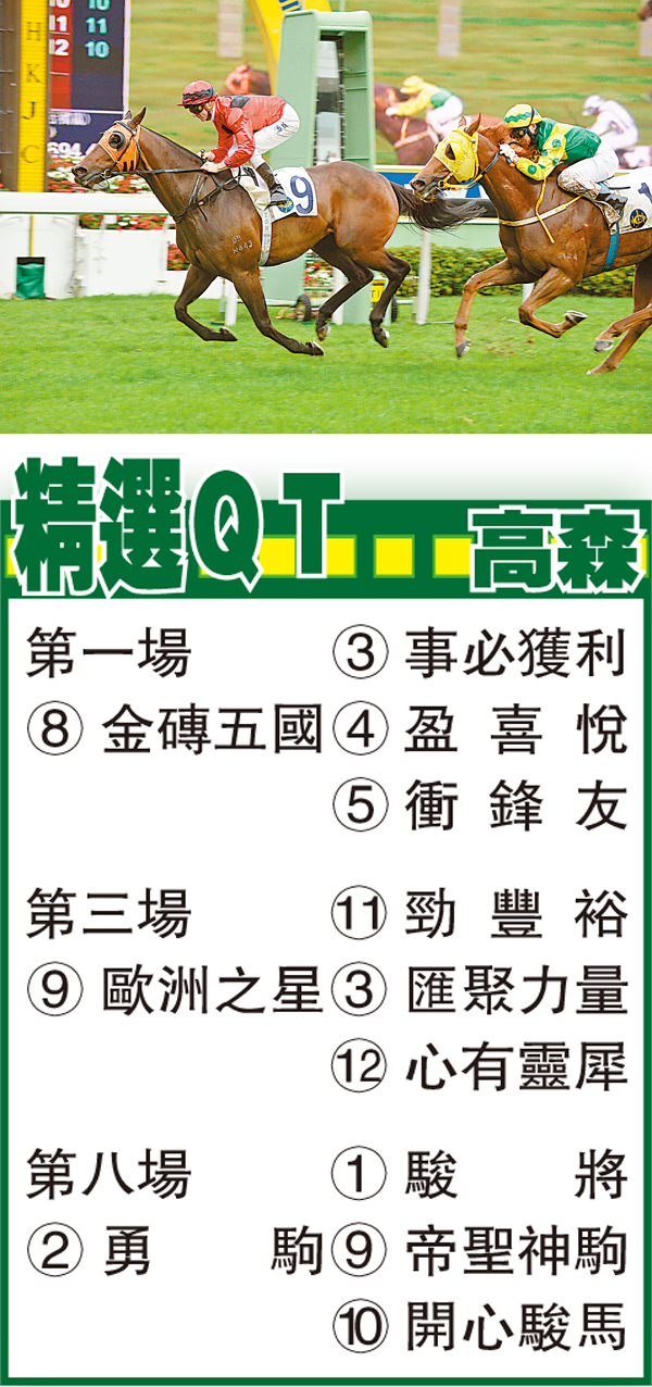 第八場、第三班、一六五○米。「勇駒」今季四戰同程取得冠亞軍各一,當中的一亞一季分別以短頭及頸位僅敗,而三甲不入一役是敗在角逐好至黏地,可見在正常場地競逐,實力當可睇高一線。「帝聖神駒」月初試千二米泥閘,起步即領放在前,入到直路按韁得第四名,但過終點後稍鬆韁繩即逐步加速,再反先前三駒,更有易放難收之感,狀態已見復甦,要提防。