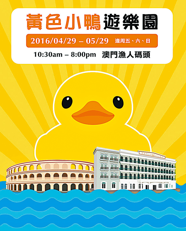 自2016年4月29日起,到5月27日的每星期五至日,「黃色小鴨遊樂園」將在澳門漁人碼頭舉行,那裡有美食、美景、老少皆宜的小遊戲。帶上您摯愛的家人齊齊來參與,和黃色小鴨一起快樂每一天。