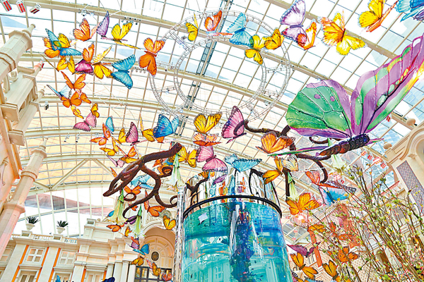 美國著名裝置展示設計大師史提芬.史提芬奴(Stephen Stefanou)再次於天幕廣場發揮超凡的創造力,利用過百件達4呎x8呎闊的玻璃精品建構出效果瑰麗、形態典雅的蝴蝶天堂,是每位賓客不容錯過的全新感觀體驗。史提芬奴更特意調低6隻24呎大的巨型蝴蝶的位置,使其盤旋於廣場核心位置的水族館,令參觀者恍若時而置身於水底,又時而身處在花園,如夢似真。