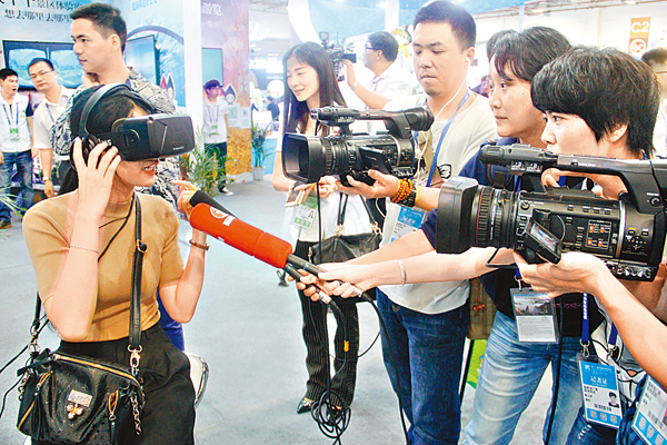 ■在福建廈門舉辦的海峽旅遊博覽會上,一名女子正用VR眼鏡體驗360度遊覽廈門的虛擬實境。 記者米南 攝