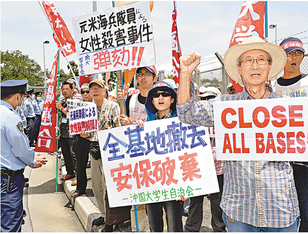 駐日本沖繩的美軍文職人員涉嫌殺害年輕女性後棄屍,觸發新一輪反美軍示威,約250名沖繩民眾昨日到美軍沖繩嘉手納基地抗議,要求「美軍撤走全部基地」、「滾出沖繩」。鑑於事件可能令沖繩美軍基地搬遷問題再添波折,日本擺出強硬姿態,報道更指首相安倍晉三計劃在下周舉行的七大工業國集團(G7)峰會上,當面要求美國總統奧巴馬嚴肅處理。