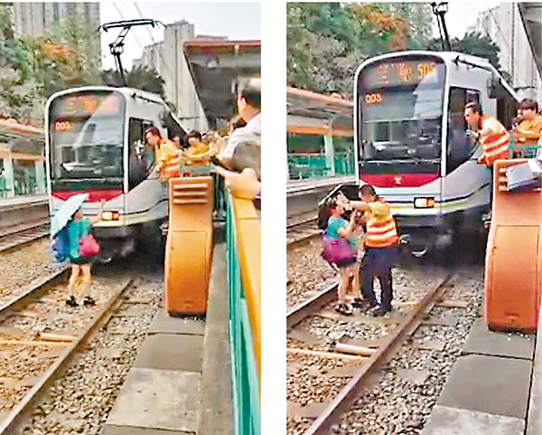 ■躁婦站在路軌以身擋車(左圖),張開雨傘與月台上的輕鐵職員爭執。另一名職員趕至將婦人勸返月台(右圖)。 網上圖片
