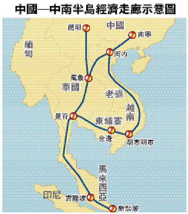 中國-中南半島經濟走廊以中國廣西南寧和雲南昆明為起點,以新加坡為終點,縱貫中南半島的越南、老撾、柬埔寨、泰國、馬來西亞等國家,是中國連接中南半島的大陸橋,也是中國與東盟合作的跨國經濟走廊。