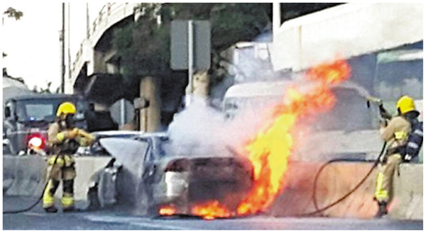 長沙灣呈祥道西行線近盈暉臺對開,昨清晨6時許發生驚險交通意外,一輛私家車懷疑切線時意外撞及鄰線一輛旅遊巴士車身後,一度在路中打轉再撼向路壆始停下,全車隨即起火焚燒,瞬間陷入火海,幸女司機及時落車僅受輕傷。警方正對撞車及起火原因展開調查,受事件影響,現場一帶交通擠塞,車龍一度長達3公里,直至早上10時20分,現場清理後交通始復常。及時逃過大難的女司機姓李(40歲),事後因感到頭暈及手部擦傷需送院治理。至於被撞旅遊巴,當時正擬往青衣接載遊客,34歲姓何司機無恙,惟右邊車身毀爛。 文:杜法祖