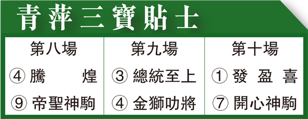 第九場、第三班、一六五○米。「總統至上」五歲仔季內唯一勝仗鬗G月份出爭田草千四所得,至於上場練者安排首次渡江爭一哩,三檔起步一早守好位,入直路羅理雅抄出外疊打衝鋒跑第四,可見跑窄場必合發揮,拚後打仔馬仍由羅理雅一手打磨,今仗原庄人馬再戰,屆時半冷可敲之。