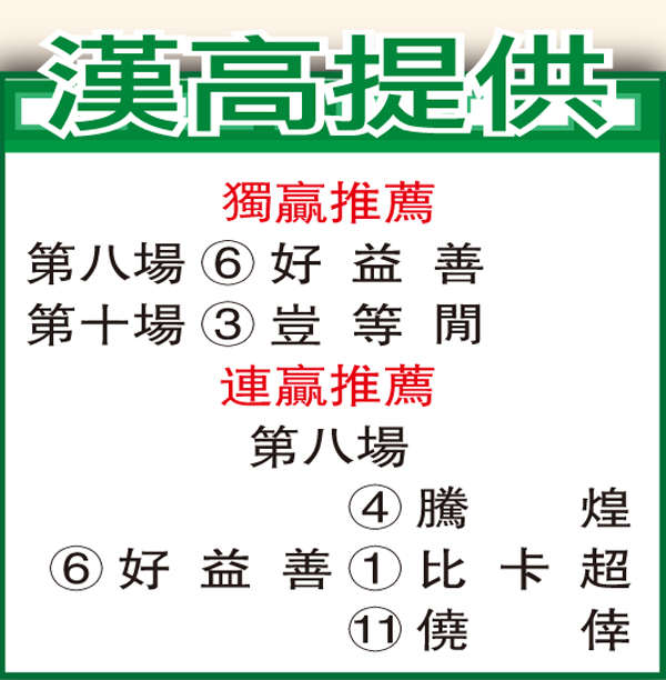 「好益善」副練踱一圈,沿途試來小心翼翼,步幅開揚有力,馬身輕巧,神采奕奕,毛水靚,勇況絲毫未減。