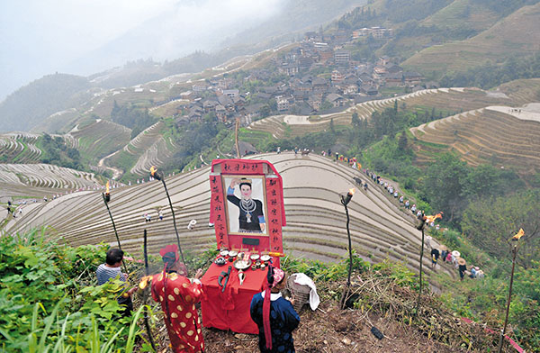 廣西桂林市龍勝各族自治縣龍脊鎮平安村昨日舉行一年一度梳秧節。目前,龍脊梯田進入全面插秧季節,梯田水滿泥潤,當地農民在田間偶耕、梳秧、插田。圖為祭「秧母」。 圖/文:中新社