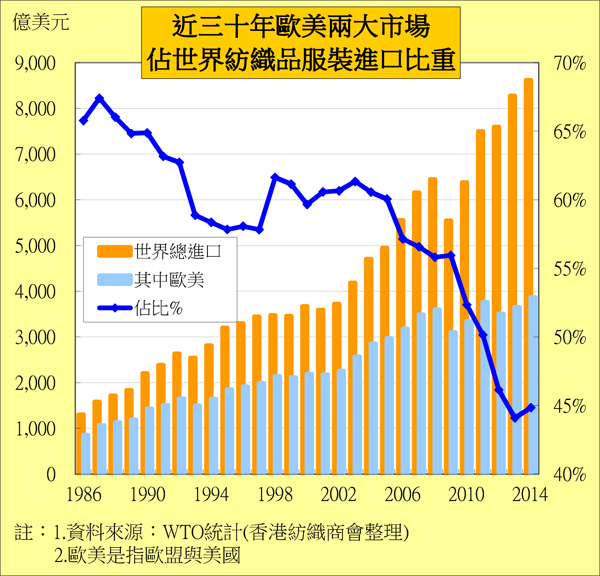 從近三十年世界進口紡衣的情況來看,歐盟、美國合佔世界總額的比重正不斷下降,如八十年代最高時(1987年)達67.4%,至2006年降至57.1%,2014年更只為44.8%即不到四成半(見附圖)。其中服裝降勢更為突出,八十年代最高(1987年)年比重為78.4%,2006年跌至67.8%,到2014年縮小至53.2%,高低相差25.2%。這一變化,反映了紡衣出口需另尋出路,開拓新市場的必要性和急切性。