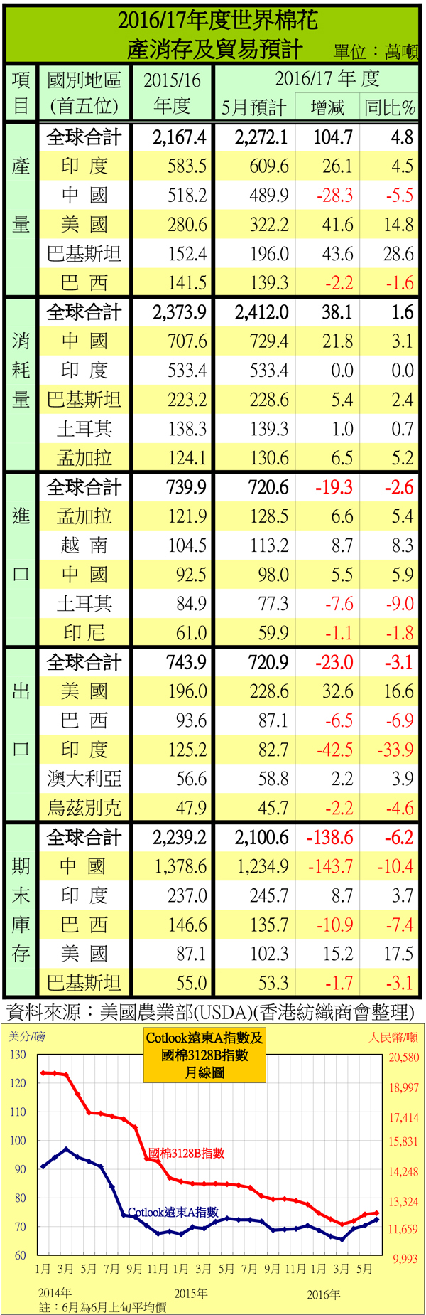 美國農業部(USDA)5月首次發表2016/17年度世界棉花產銷預計,與2015/16年度相比,產量、消耗略增,進、出口貿易均減,期末庫存則有較大下降。