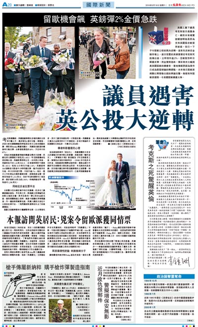 英國工黨下議員考克斯前日遇襲身亡,雖然未有確實證據證明她是因為支持英國留在歐盟而被殺,但已一下子令脫歐公投的風向逆轉,並率先反映在金融市場上。連日受壓的英鎊匯價在考克斯死訊傳出後,立即回升逾2%,亞歐股市昨日顯著反彈,而金價則急跌,博彩商亦大幅提高英國留歐的機會率。當地傳媒更認為事件已成為脫留辯論的轉捩點,未來幾日脫歐派將難以再發動尖銳的輿論攻擊,無疑有利留歐派選情,令英國脫歐機會大降。