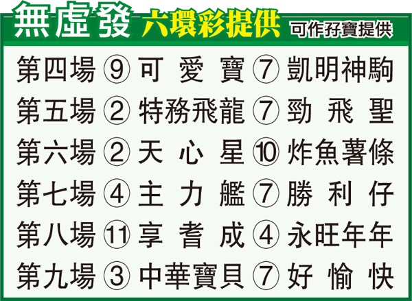 第四場「可愛寶」前仗在同程後上輕勝一馬位,上仗轉戰田草二千米對手增強仍獲亞軍,證明本身持續增值,重返谷草勝途上陣,力足謀三捷。「凱明神駒」近六仗四度上名,跑中長途可前置經常賺形勢,前駒有失即可代之而起。