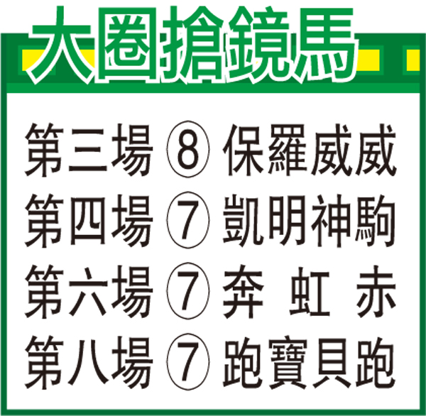 「凱明神駒」助手試一段,末段輕輕放鬆即主動增速越衝越快,出腳低揚力雄渾,餘勢甚佳,馬身粗壯結實,毛色鮮潤亮麗,神情專注具心火,近態方面已達勇點。