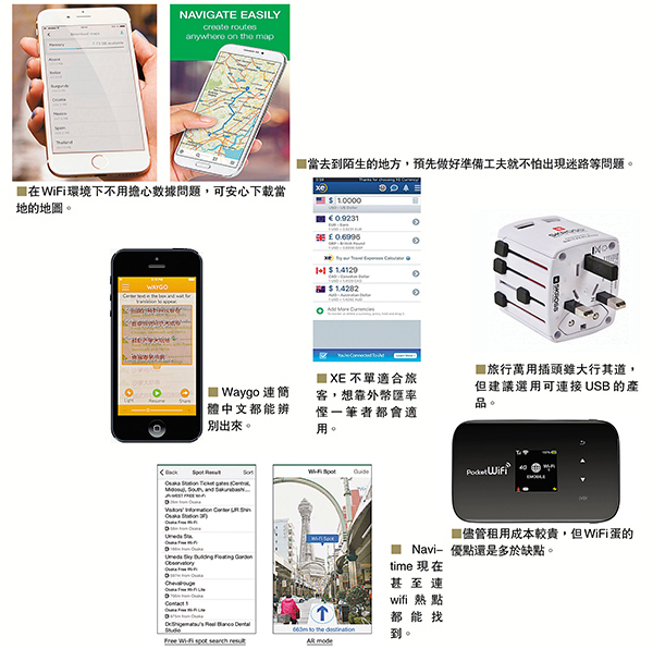 因為上述的app連同使用facebook和IG等,都會消耗手機不少電量,加上影相拍片以至WhatsApp等日常功能,隨時未夠半日便「乾塘」。所以「尿袋」亦是當今外遊的必需品之一,建議別用電量少於5000mA的這類產品,免得經常要為它「回血」。至於WiFi蛋和數據卡該選用哪款方面,筆者是傾向前者,一來可讓幾部手機連上網絡,適合兩口子以至全家人需要。二來iPhone要用金屬針方能取出sim卡,換卡又有機會意外跌掉,更無法接收香港的緊急來電,整體而言弊多於利。