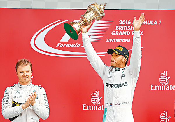 衛冕的平治車隊英國車手咸美頓(右)昨晚F1英國站排頭位出戰,最後比戰車出現故障的隊友羅斯保(左)快6.9秒衝終點贏出,四奪此站冠軍,現總積分只差第1位的羅斯保4分。 路透社