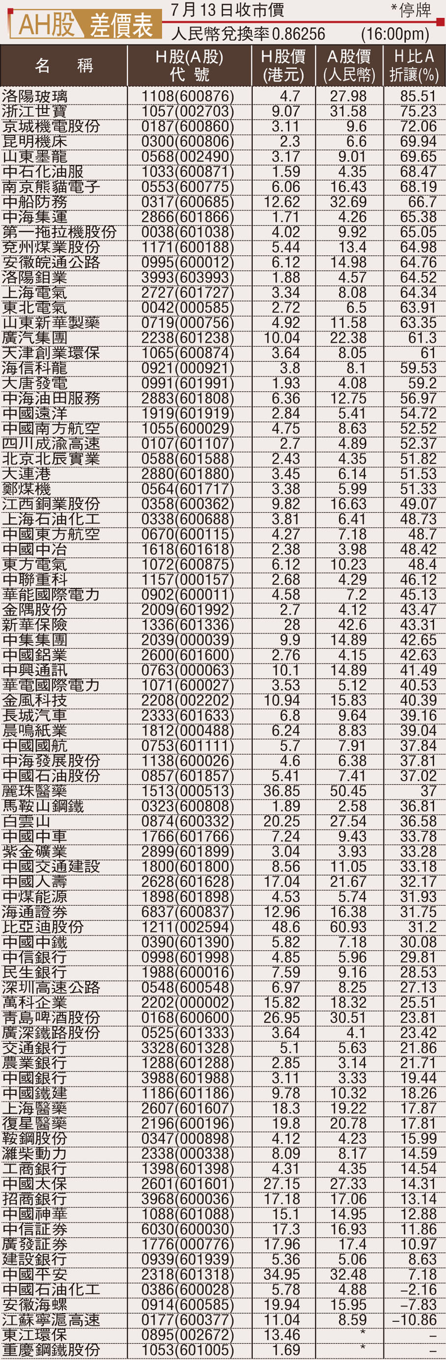 AH股差價表