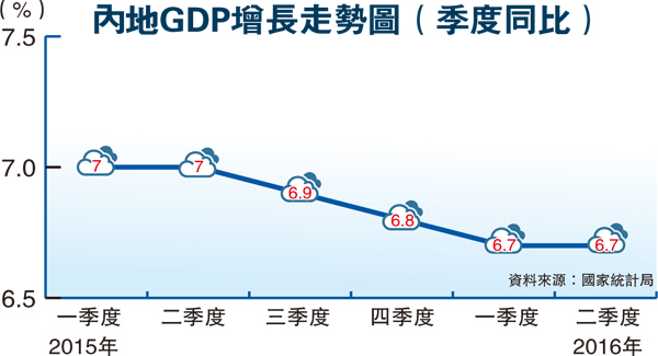 香港文匯報訊(記者 海巖 北京報道)內地二季度GDP同比增速持平於一季度。經濟學家分析指出,內地經濟下行壓力依然較大,外需下滑、民間投資持續疲弱以及房地產業下滑將是下半年經濟面臨的隱憂,建議政府當務之急是提振企業信心,防止經濟失速下滑。