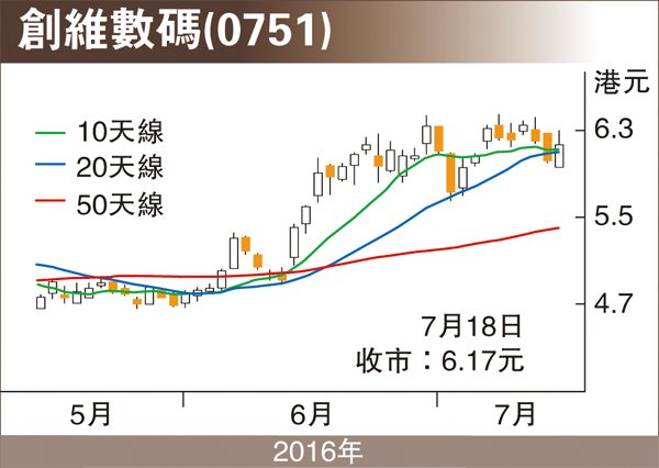 投資氣氛續改善,個股炒味也見轉濃,家庭電器及用品板塊便不乏熱捧對象,其中創維數碼(0751)曾高見6.3元,最後回順至6.17元,仍升0.15元或2.49%,走勢上,10天及20天線得以失而復得,有直逼52周高位6.69元之勢。