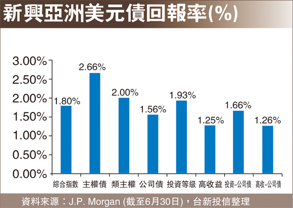 邱奕仁指出,亞債因獲資金追捧,6月份指數表現優異,JACI亞洲美元債券指數之亞洲投資等級債上漲1.8%,亞洲高收益債上漲1.5%,其中,亞洲高收益債券收益率因下跌40點子至6.7%。