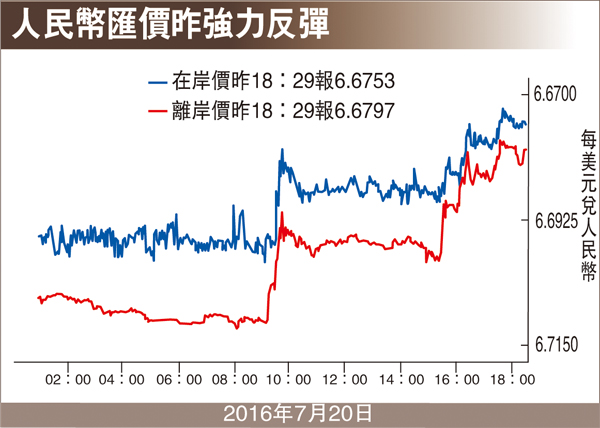 人民銀行昨日公佈的中間價為6.6946,較前一個交易日上升25點子。在岸CNY和離岸CNH雙雙上升200餘點子,其中CNY更創逾一個月最大漲幅。多位分析員均認為,6.7是監管層穩定人民幣匯率的一道防線。