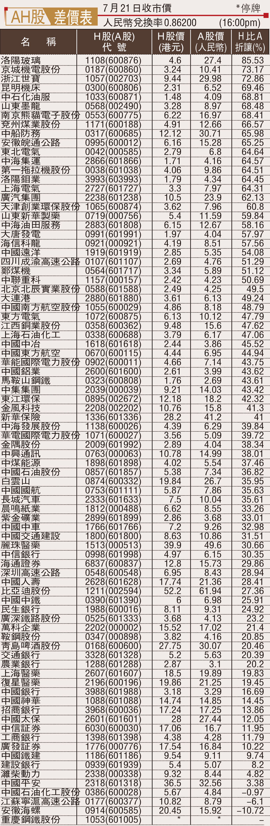 AH股差價表