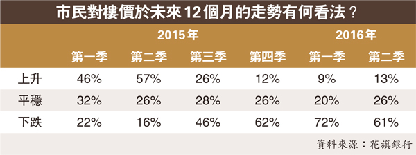 今年第二季認為樓價會在未來12個月下跌的受訪者比例,自2015年第二季開始連升三個季度後首次出現回落,並由2016年第一季創歷年新高的72%,下跌至61%。而2016年第二季認為樓價會在未來12個月上升的受訪者比例重上雙位數字,由2016年第一季的9%上升至13%。