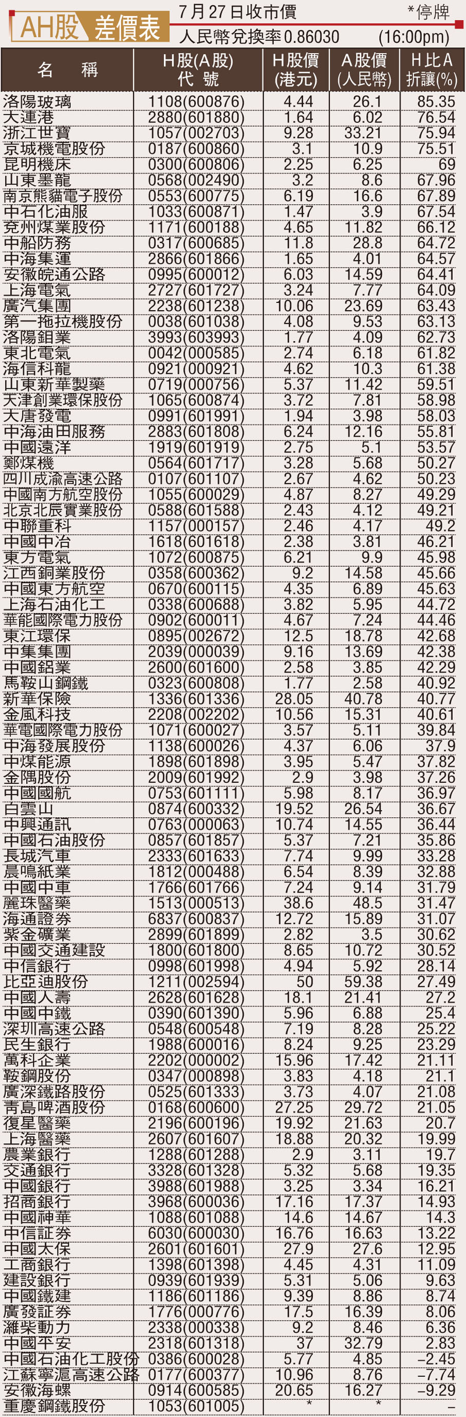 AH股差價表