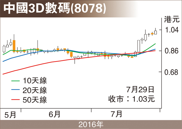 中國3D數碼(8078)在上周的波動市中表現相當硬淨,特別是上周四、五細價股急跌下,仍能逆市上升3%,收報1.03元,成交達2,500萬元,走勢強橫。