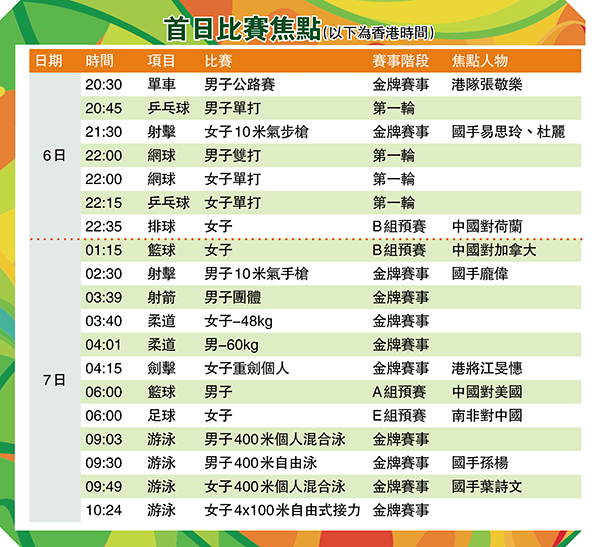 首日比賽焦點(以下為香港時間)