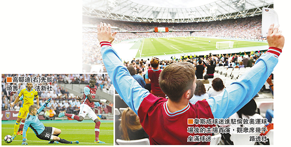 至於歐霸盃方面,韋斯咸附加賽對手抽中艾斯特拉,這支羅馬尼亞球隊上季在歐霸第3圈外圍賽正正曾將槌仔軍踢出局。昨凌晨韋斯咸大勝對手,兩回合計反勝4:2晉級,在5.4萬名球迷打氣下告捷。槌仔領隊比歷表示:「這是新球場的第一戰,非常特別,很高興我們也踢出了好表現。」 ■記者 梁志達