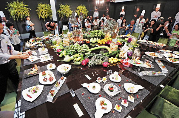 「2016美食展-台灣純真食代」昨日在台北世貿一館舉行開幕典禮,邀請知名飯店、餐廳主廚以台灣在地當季食材,推出「春夏秋冬」四季套餐,創意擺盤吸引民眾拍照留念。 中央社
