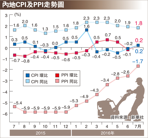 香港文匯報訊(記者 海巖 北京報道)7月內地CPI漲幅降至年內新低,但在服務價格帶動下,CPI環比漲幅轉正,同時PPI降幅亦加速收窄。考慮到近期央行頻繁向市場釋放強烈的「不會輕易放鬆貨幣政策」的信號,多數經濟學家預計,在整體通脹環比上漲的情況下,短期內地貨幣仍將維持中性穩健。然而,亦有專家呼籲,在全球齊寬鬆、國內經濟下行背景下,仍有必要在近期降準。