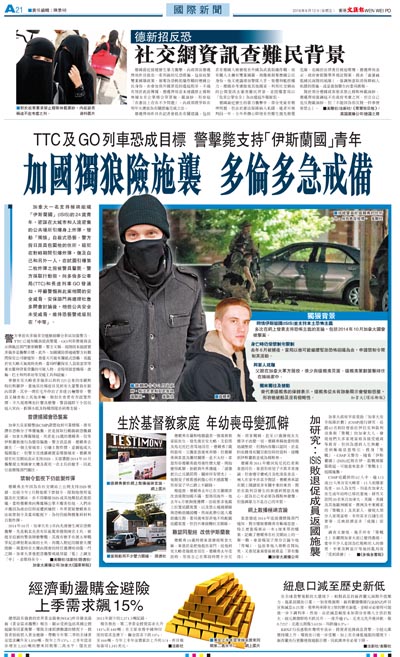 加拿大一名支持極端組織「伊斯蘭國」(ISIS)的24歲青年,密謀在大城市和人流密集的公共場所引爆身上炸彈,發動「獨狼」自殺式恐襲。警方前日派員包圍他的住所,疑犯在對峙期間引爆炸彈,傷及自己和另外一人,在試圖引爆第二枚炸彈之前被警員擊斃。警方採取行動前,向多倫多公車局(TTC)和長途列車GO發通知,呼籲警惕與此案相關的安全威脅。安保部門與總理杜魯多開會討論後,相信公共安全未受威脅,維持恐襲警戒級別在「中等」。