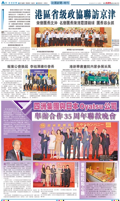 四洲集團與日本Oyatsu株式會社合作35周年聯歡晚會,8月8日於洲際酒店隆重舉行,四洲集團主席戴德豐、日本Oyatsu株式會社社長松田好旦(Yoshiaki Matsuda)等出席,日本駐港總領事松田邦紀(Kuninori Matsuda)蒞臨主禮。晚宴上,戴德豐更分享了自己與合作夥伴35年間的逸事,妙語連珠,贏得全場熱烈掌聲。數百香港與內地重要客戶應邀出席,而本月即將推出的最新代理產品「童星粒粒點心麵」,其電視廣告亦率先於晚宴上播出,讓賓朋先睹為快。■香港文匯報記者 邵萬寬