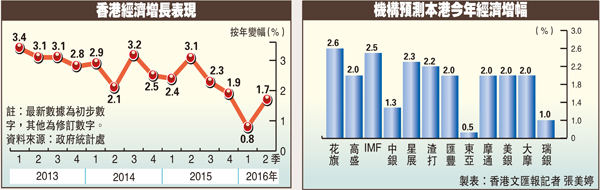 香港文匯報訊 (實習記者 鍾昊華)本港第二季經濟增長表現較多個大行預期為佳,署理政府經濟顧問歐錫熊表示,考慮到上半年1.2%的實際增長數字和外圍環境的種種挑戰,以及外圍情況倘若沒有出現重大逆轉,2016年全年的經濟增長預測維持在1%-2%不變。