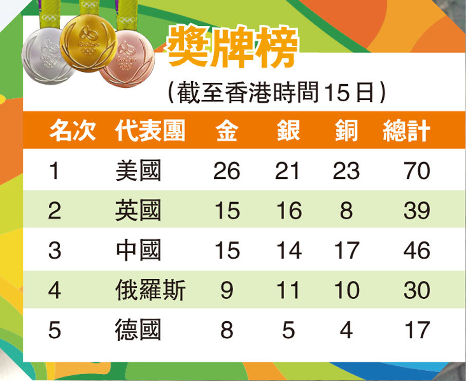 獎牌榜(截至香港時間15日)